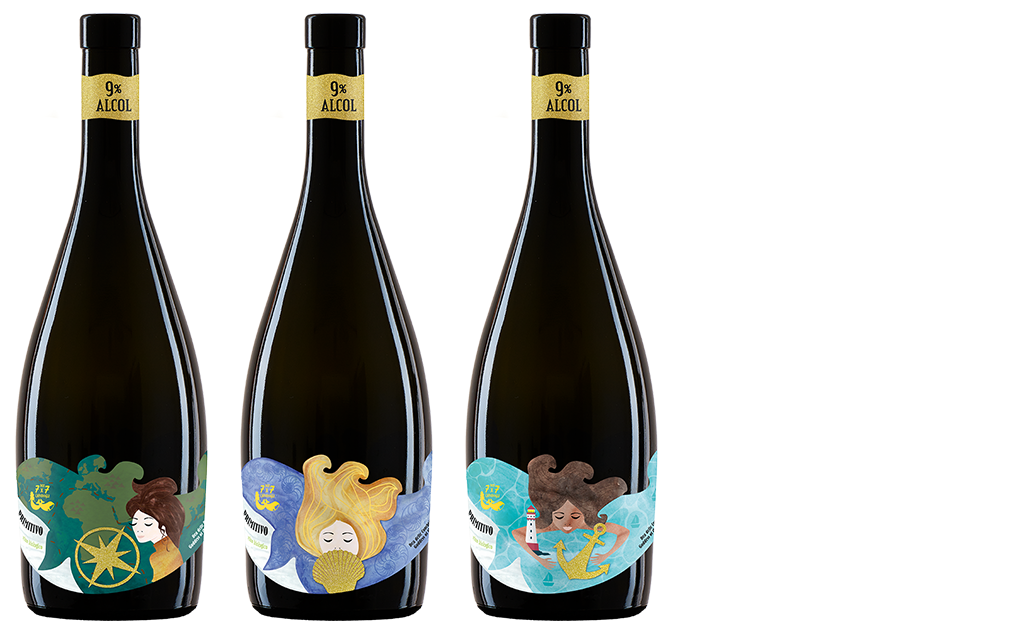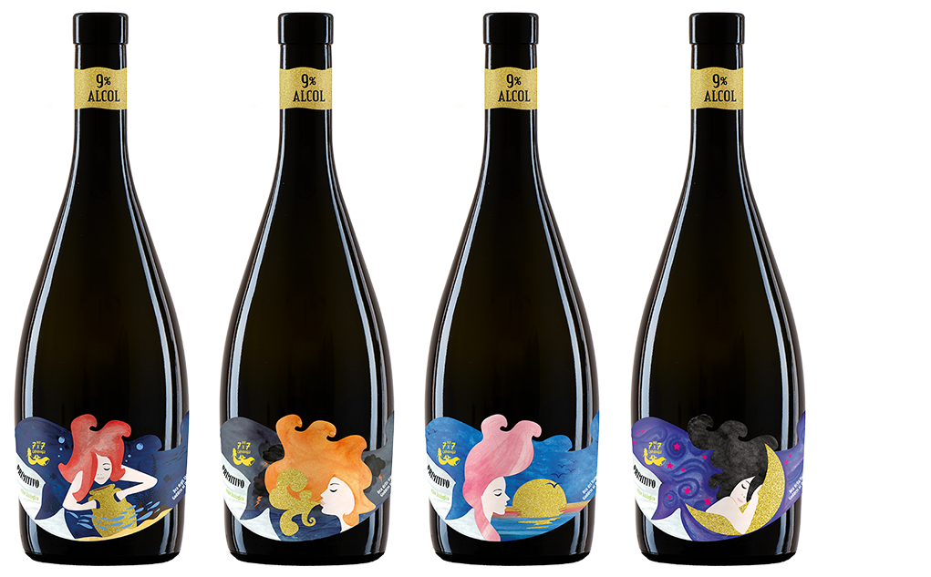 Le bottiglie presentano uno storytelling forte e una linea distintiva ad alta riconoscibilità grazie ad una immagine grafica coerente, audace e identitaria che valorizza il carattere del brand e ne amplifica l’impatto visivo. Le bottiglie, a parità di vitigno, si presentano a scaffale:
